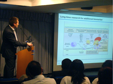 El Ponente fue el Dr. Jörn Ole Vollert de Berlín, Alemania. Es egresado de la Universidad Libre de Berlin, investigador y clínico en cardiología y Medicina de Urgencias, miembro principal y fundador de la Fuerza de Tarea para la aplicación de Algoritmos Médicos en Cardiología de la Sociedad Alemana de Cardiología, habló sobre la copeptina, una prohormona o precursor molecular de la vasopresina, también llamada hormona antidiurética, como un biomarcador de vanguardia para el diagnóstico de infarto agudo de miocardio, en combinación con la troponina.