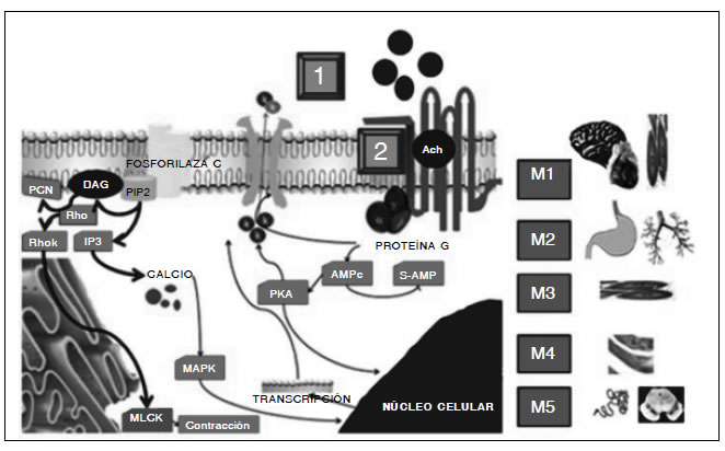 La activación de los receptores M1, M2 y M5 conducea la activación de proteínas Gs, con la consecuente producción del segundo mensajero AMPc por estimulación de una o varias isoformas de la enzima adenilciclasa, la cual se localiza en la membrana celular; ésta a su vez activa la proteincinasa C, proteincinasa A y otras cinasas sobre proteínas (MLCK y MAPK), las cuales pueden activar canales iónicos (de K+), iniciar la contracción del músculo liso (MLCK), o bien, iniciar la trascripción de genes (MAPK). Estos receptores tienen varias localizaciones en el cuerpo; dependiendo del tipo de clasificación, ejercerán una acción en el órgano efector. Un fármaco anticolinérgico no sólo logra este efecto al competir con el receptor muscarínico,2 también puede lograr esta acción al interferir en la síntesis o liberación de acetilcolina.1 Actualmente se conocen hasta 500 fármacos con acción anticolinérgica (Figura 2).