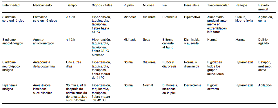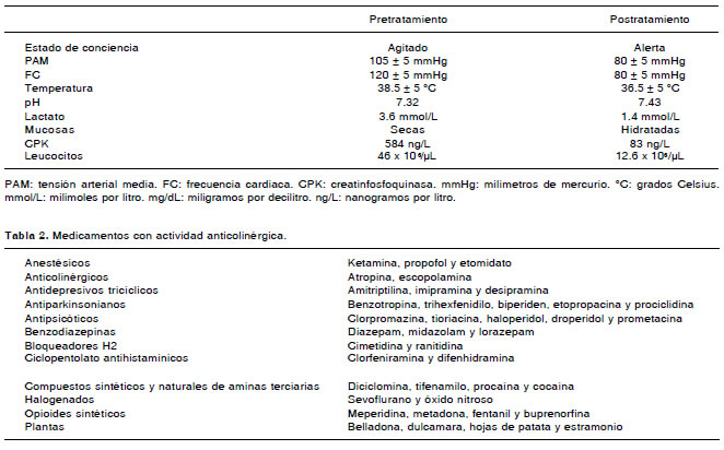 y una respuesta positiva al tratamiento con fisostigmina.11 El diagnóstico diferencial se debe realizar con el síndrome serotoninérgico, el síndrome neuroléptico maligno y la hipertermia maligna (Tabla 4).