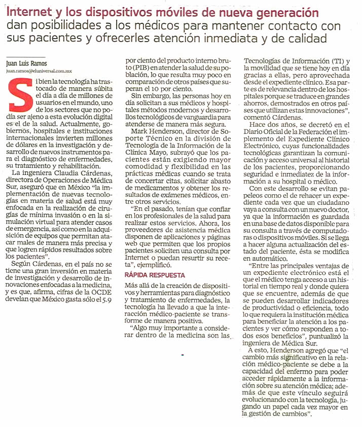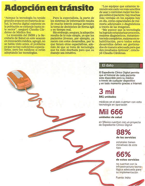 La ingeniera Claudia Cárdenas, directora de Operaciones de Médica Sur, aseguró que en México "la implementación de nuevas tecnologías en materia de salud está muy enfocada a la realización de cirugías de mínima invasión o en la simulación virtual para atender casos de emergencia, así como en la adquisición de equipos que permitan atacar males de manera más precisa y que logren rápidos resultados sobre los pacientes"